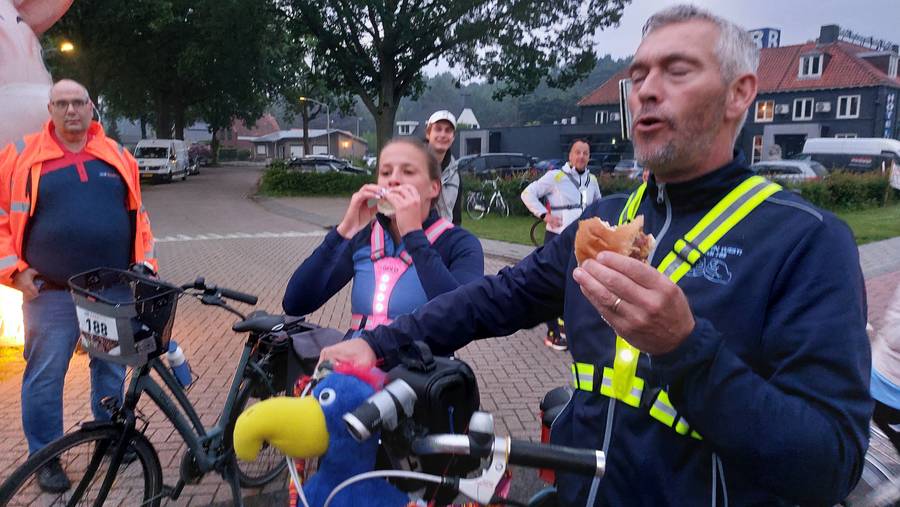 Tessa Govers en Ad Gladdines van team Maak een Vuist uit Halsteren laten zich in Hoogerheide het broodje ei met spek goed smaken.