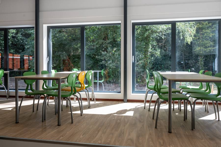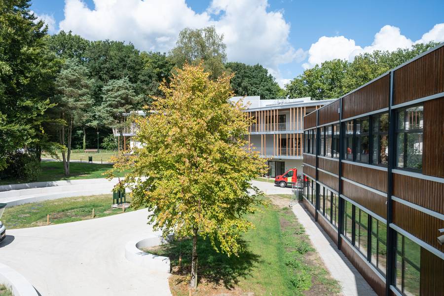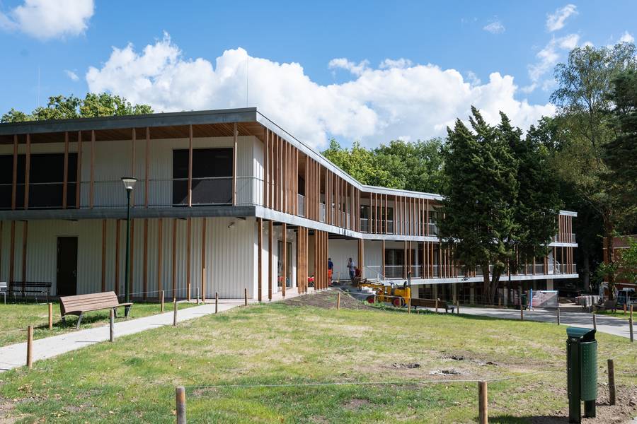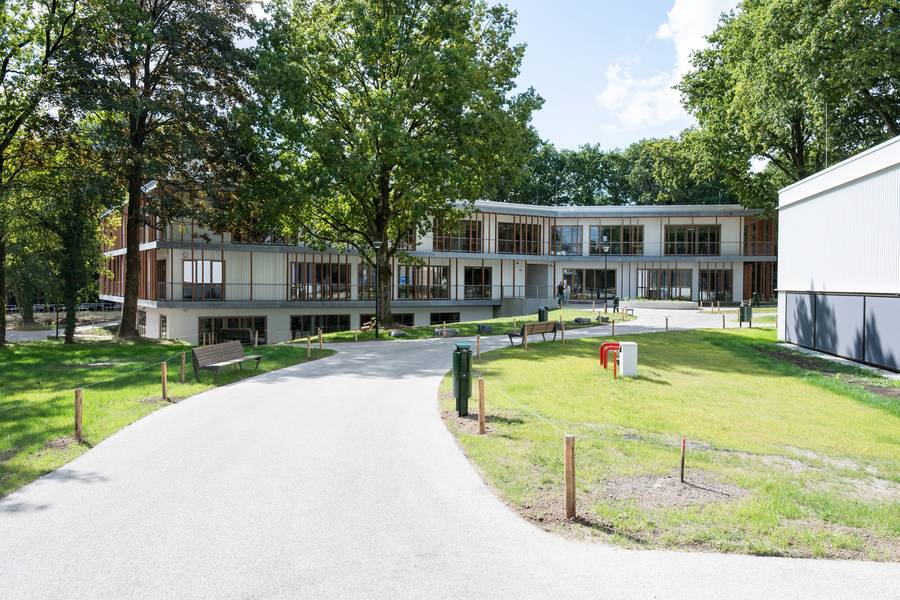 Een van de vier gebouwen van De Amersfoortse Berg. De puien kunnen geheel worden opengeschoven voor ‘openluchtonderwijs’ op overdekte veranda’s.